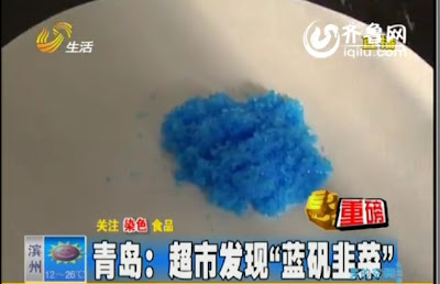 內地菜販為保持蔬菜鮮,無所不用其極,繼山東揭發甲醛大白菜後,江蘇也發現噴灑工業化學原料藍礬的韭菜。南京有市民投訴,日前清洗韭菜時,竟發現掉下藍色粉末,手指也染成藍色。..藍礬韭菜